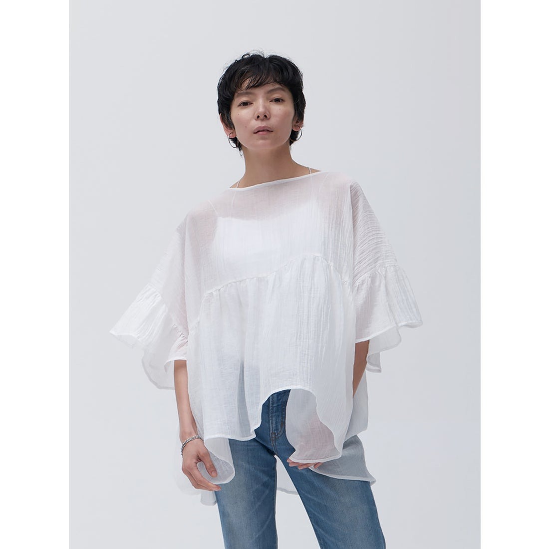 肌をほんのり透かせることで、抜け感や柔らかさを演出。