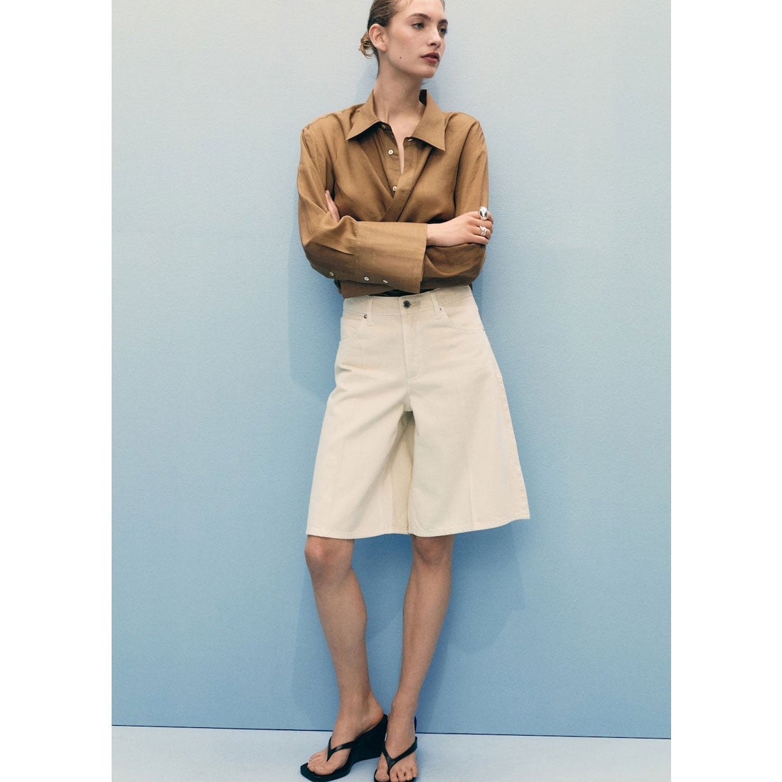 膝丈のバミューダショーツが今季の注目アイテム。