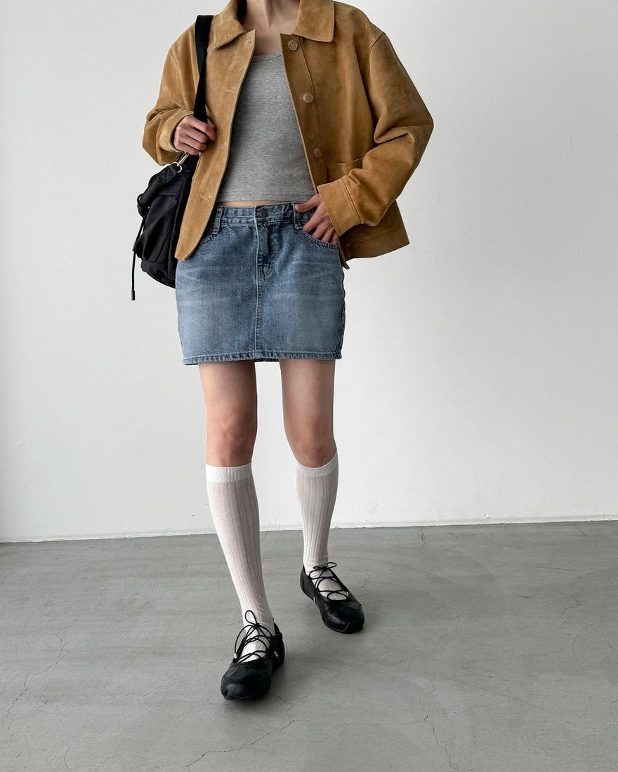 10.【クロップド丈のトップス×デニムミニスカート 大胆な肌見せで若々しく!】