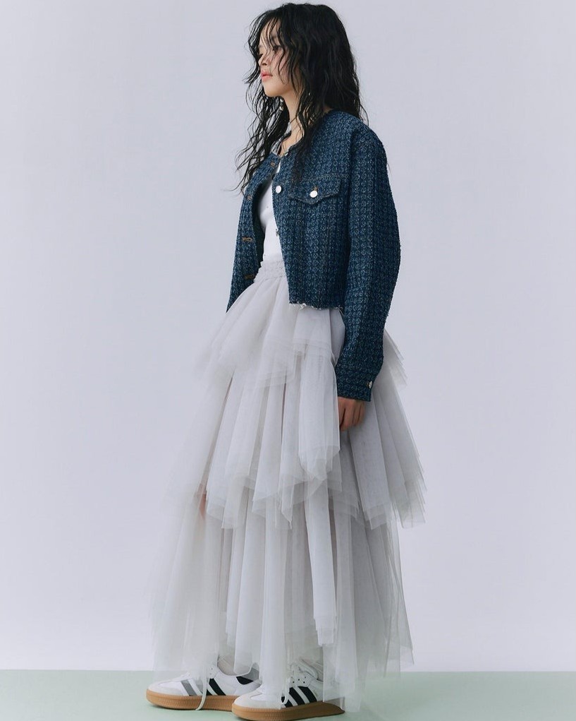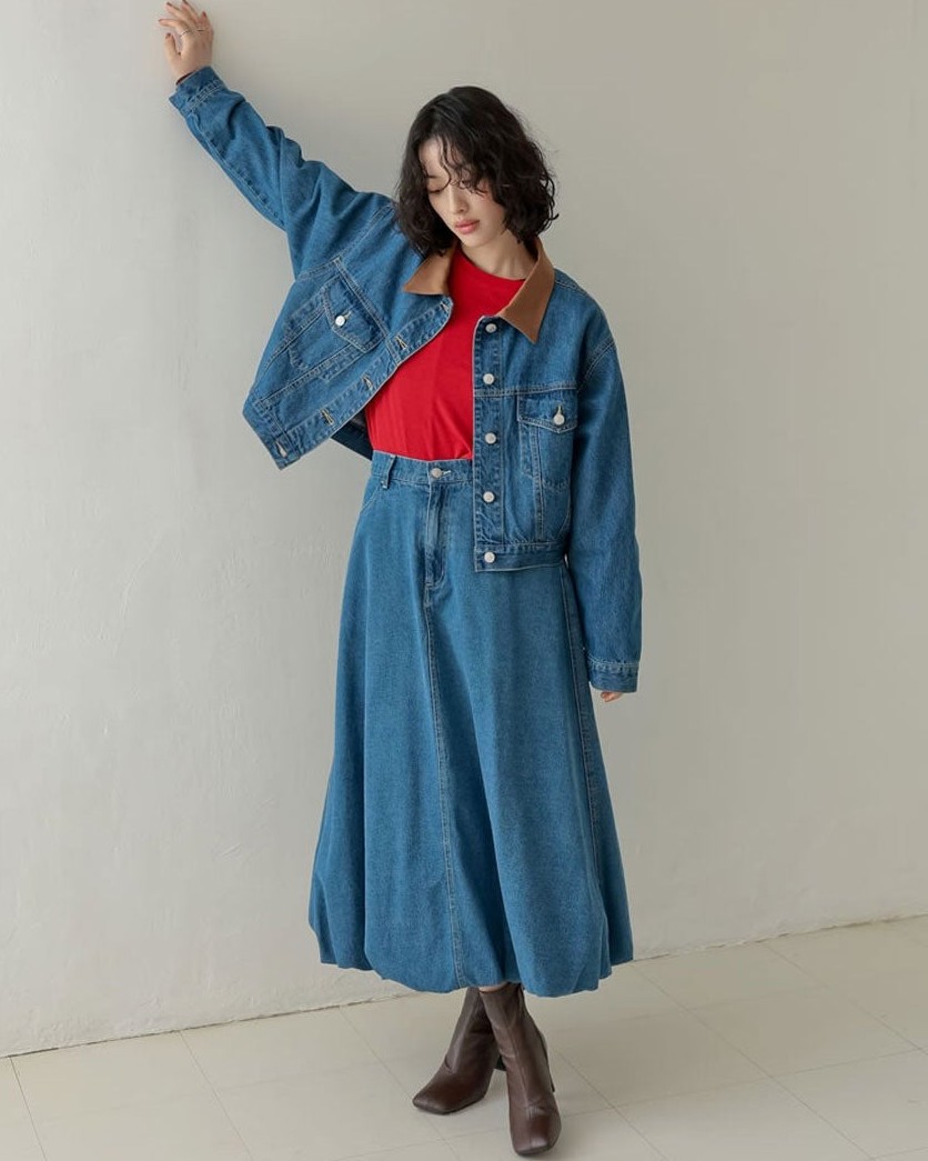 3.【ボリュームスカート×クロップド丈のデニムジャケットでバランスよく◎】