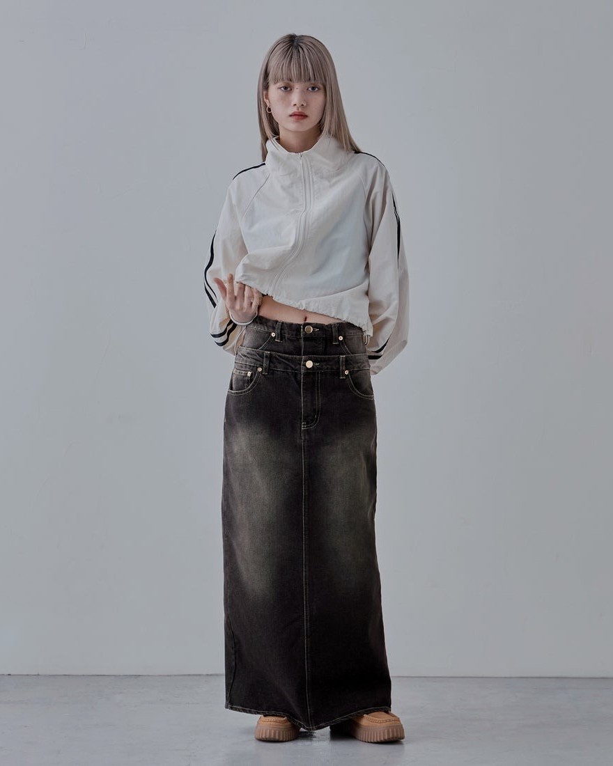 今季大注目の「トラックジャケット×デニムスカート」の組み合わせは、抜け感たっぷりのトレンドカジュアルスタイルにぴったり。