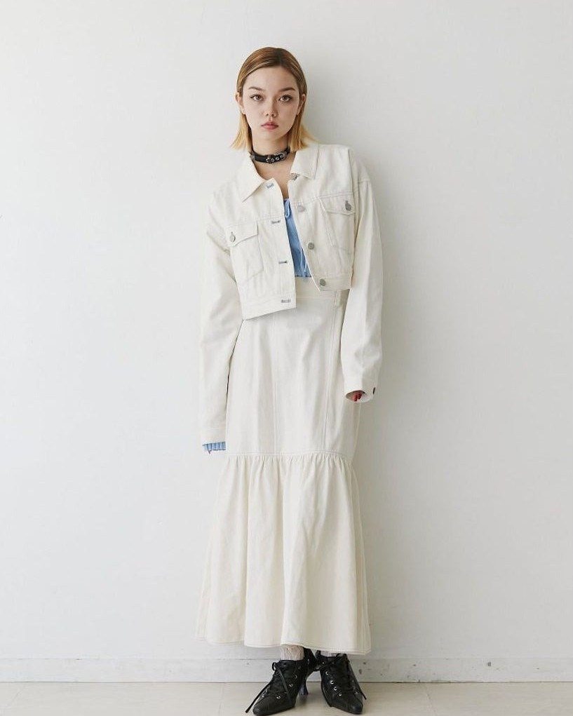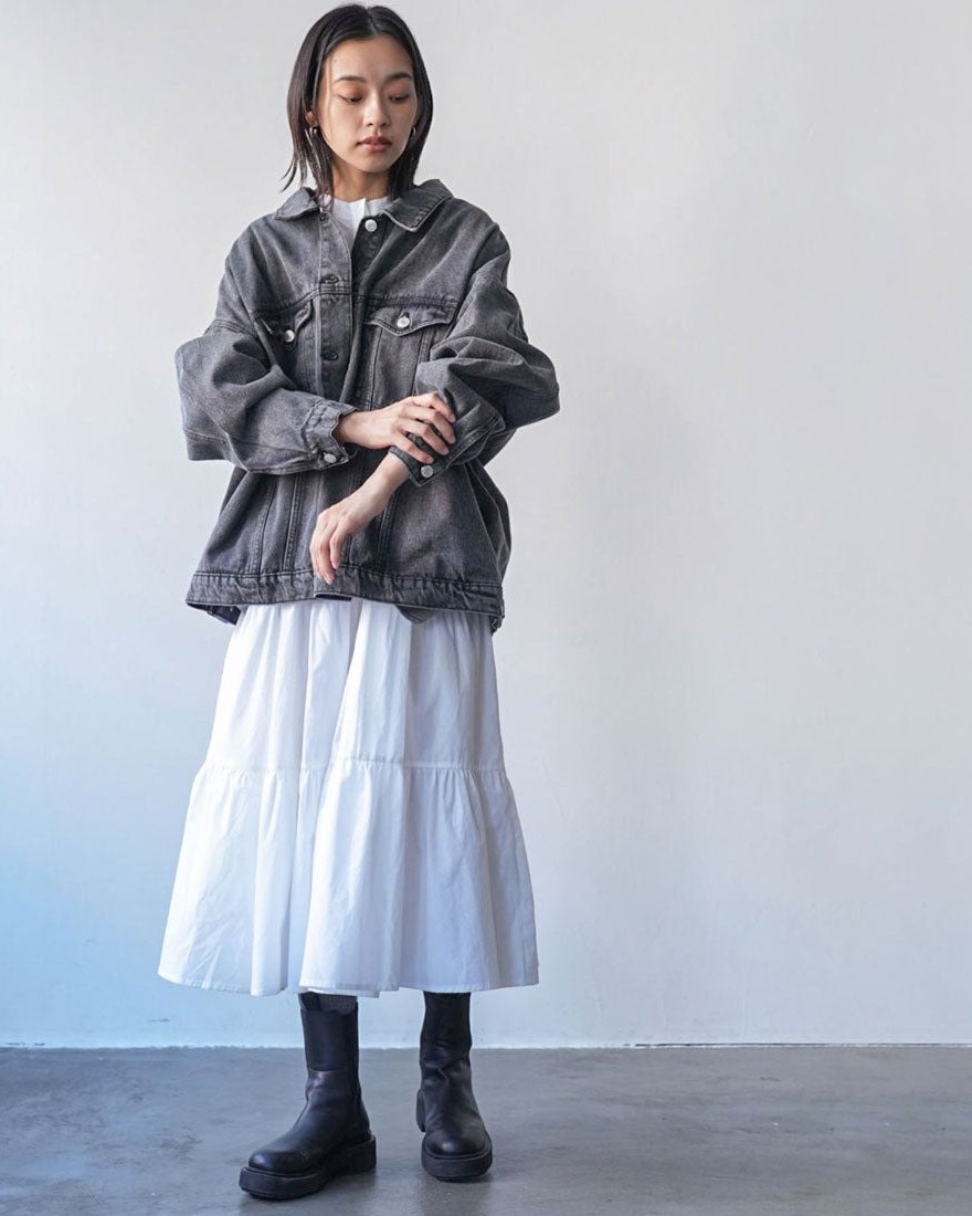 白のティアードワンピースなど、1枚で着るにはフェミニンなアイテムには、辛口のデニムジャケットが相性抜群!