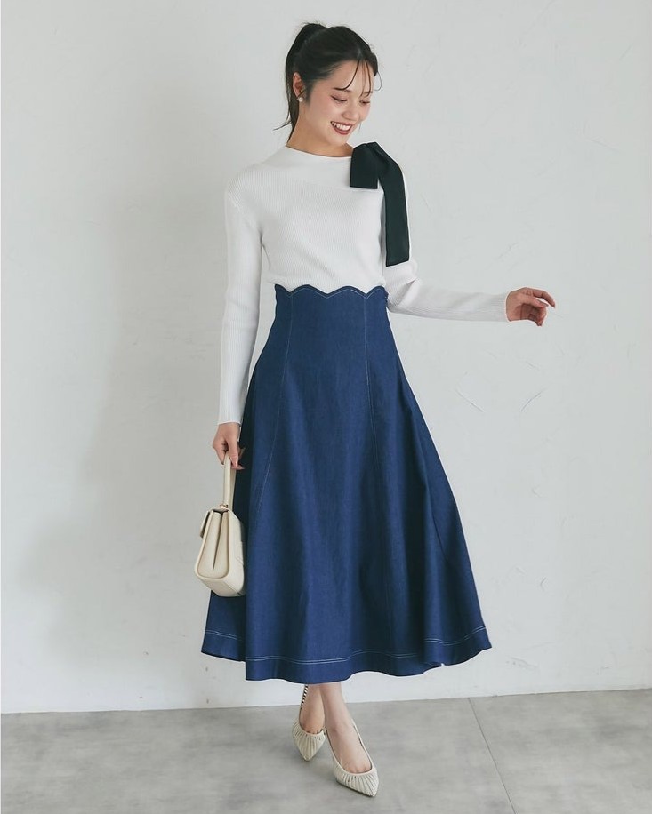ブラウス×フレアスカートというかなり上品なスタイルにあえてデニム素材を追加。
