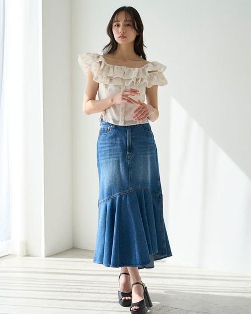 6.【フェミニンなホワイト系トップス×ブルーのデニムスカートは夏にぴったり爽やかコーデ】