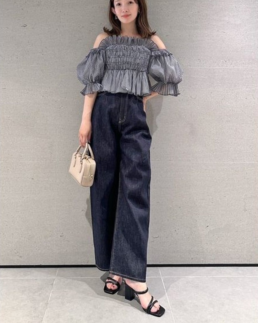 17.【フェミニンなトップス×ワイドデニムパンツでバランス◎ガーリーコーデ】
