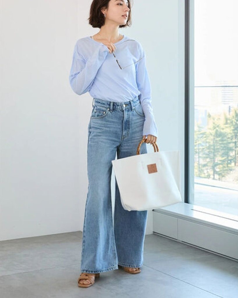 ワイドめのデニムでも合いますが、細めのデニムパンツを合わせることで、上品なお姉さん感が演出できます。