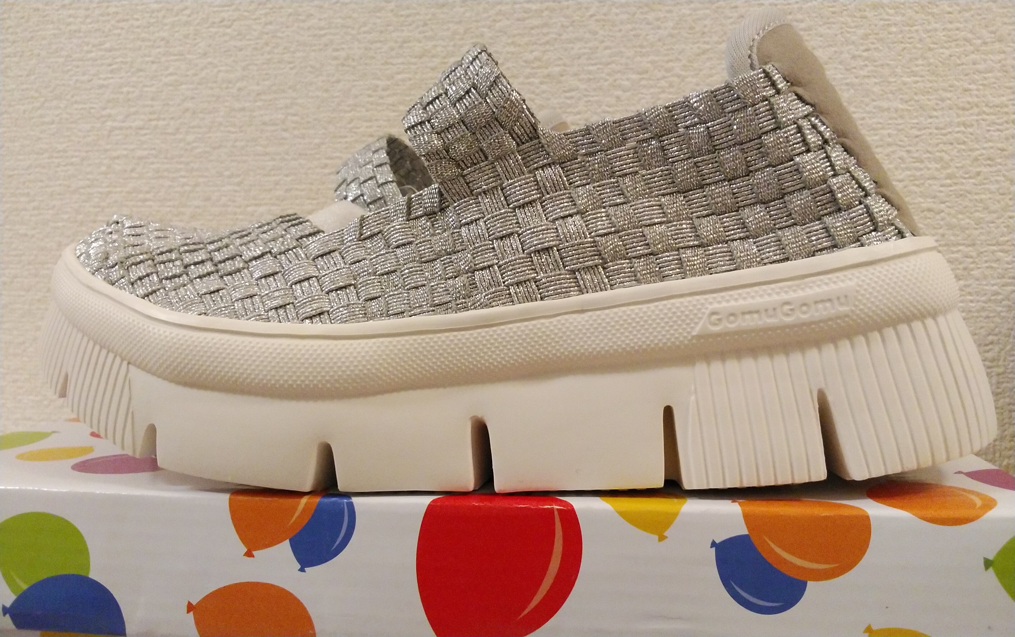 画像を見て、モザイク柄の様でお洒落だなと購入しました。 実物は想像したよりラメ感が強く、かなり光に反射して輝きます。 最初は、失敗した…?と思ったんですが、履いてみるとそこまで悪目立ちせず可愛くて気に入りました! Gomu56の靴なので、履き心地、サイズ感共に最高でした。