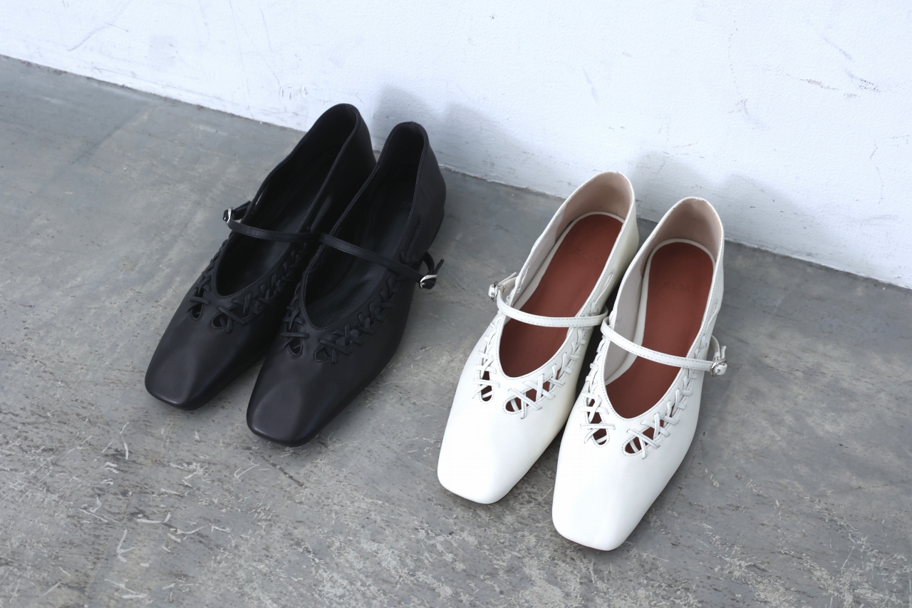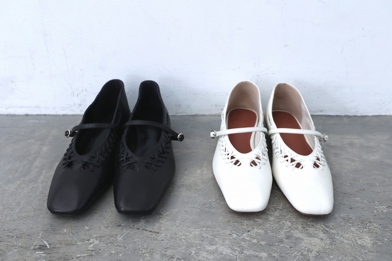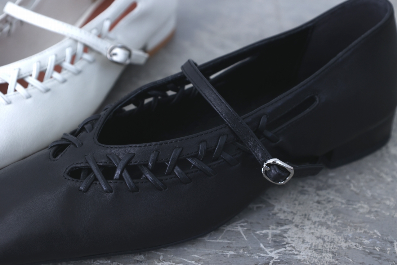 履き口の編み上げディテールがポイントのメリージェーンパンプス。