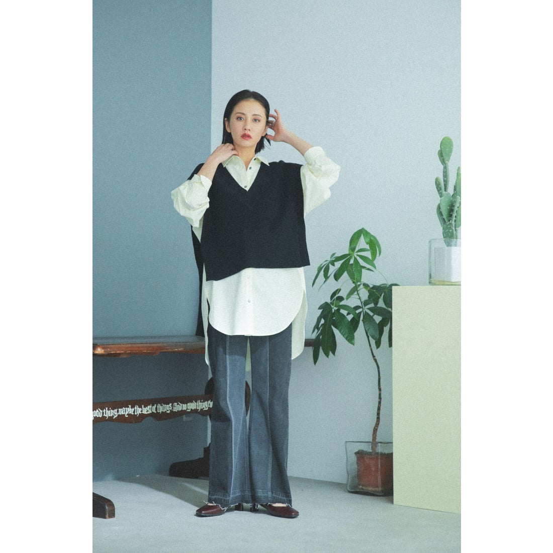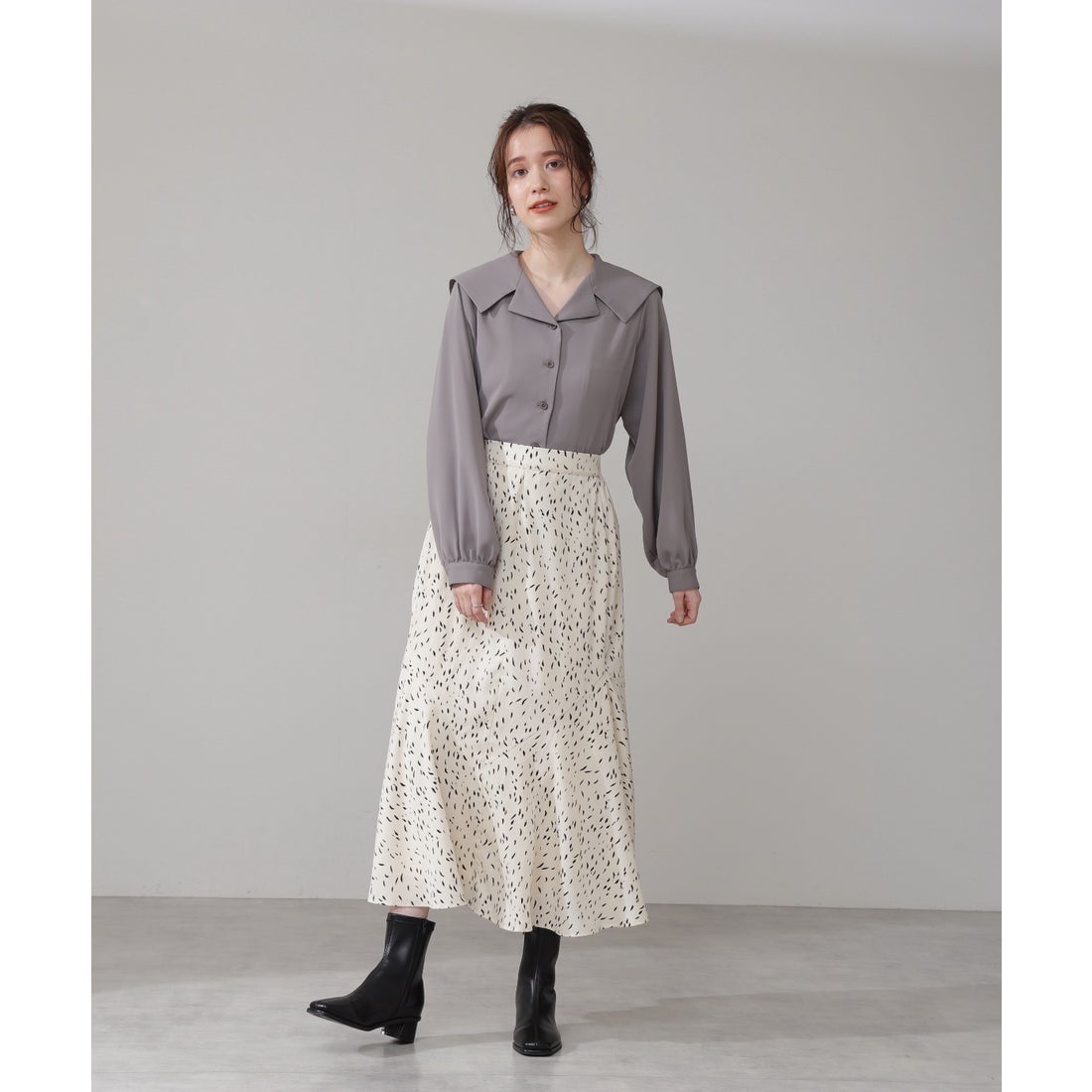 全体的にトーンを抑えた優しい雰囲気が特徴で、リラックス感のあるスタイルと好相性。