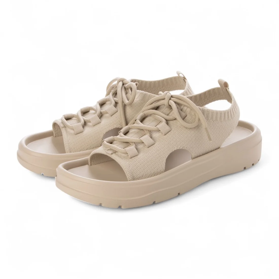 柔らかなニット素材とレースアップ仕様で、スニーカー感覚で快適に履けるスポーティーなサンダル