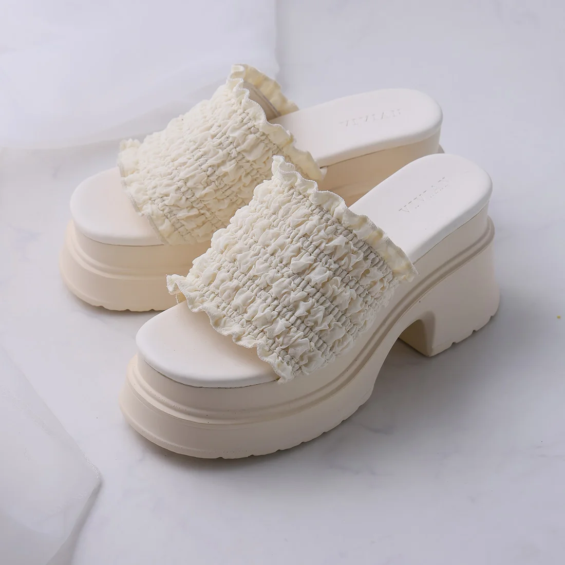 ■フリルギャザー厚底プラットフォームミュールサンダル (アイボリー)