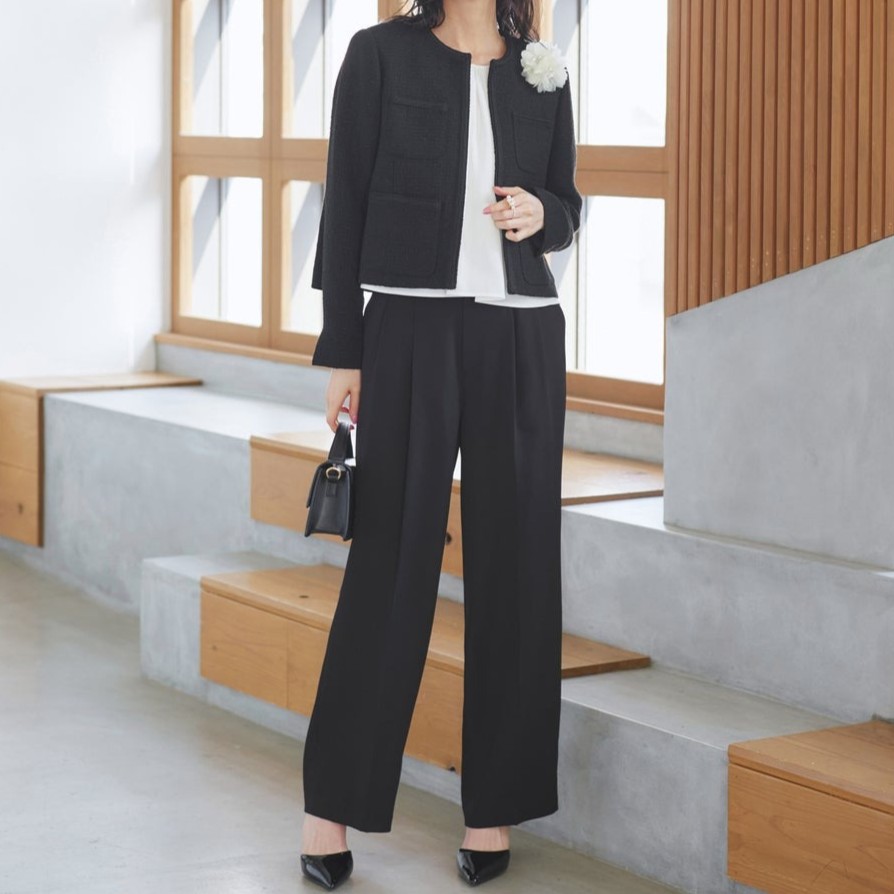 特に、お腹周りやヒップをさりげなく隠すゆるシルエットのパンツスーツは、式典後もデイリーに使いやすく、コスパを重視する40代に支持されています。