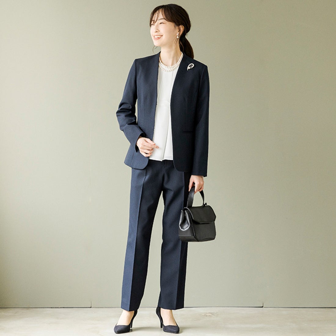 日本を代表するフォーマル専業メーカー。長年蓄積された日本人女性の体型データに基づいたカッティングは、40代の気になるラインを自然に整え、品格のある佇まいを叶えてくれます。卒業・入学式はもちろん、その後の冠婚葬祭や学校行事まで長く使える「一生モノ」の品質が魅力。トレンドに左右されない端正なアンサンブルから、モダンなパンツスーツまで幅広く揃います。