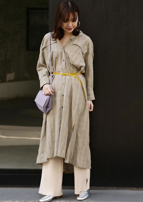 薄手のロングシャツワンピースをニットパンツと合わせて大人っぽく。