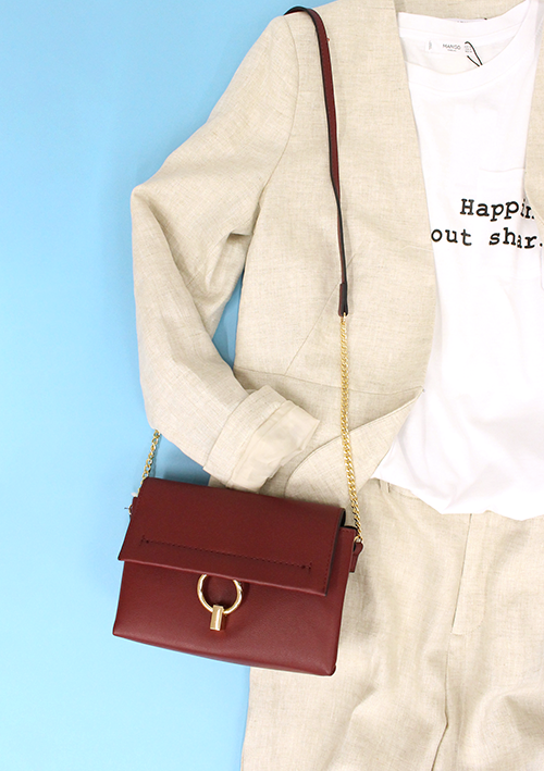 着回しの利くリネン素材のセットアップは、ロゴTと差し色のボルドーで大人カジュアルに着こなして。
