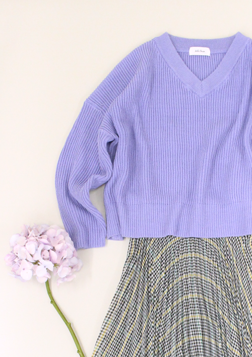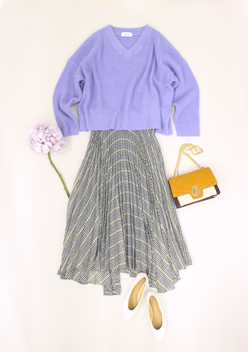 ランダムヘムラインがコーデに動きを生み出す、Mila Owenの新作プリーツスカートをメインに、ラベンダーカラーが映えるバックリボンVネックニットを合わせて。