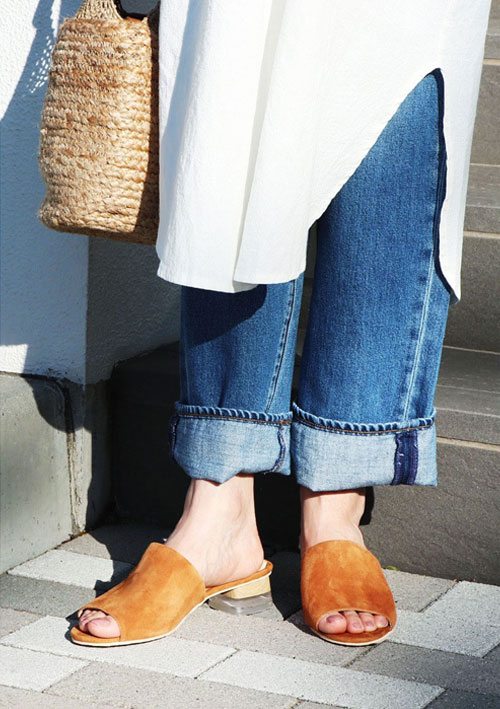 カジュアルになりがちなデニムスタイルも、シンプルなミュールを合わせることで綺麗めな印象に仕上がり、大人キャメルカラーもコーデを上品に引き立ててくれます。