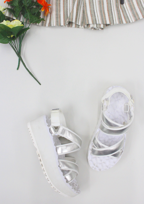 足元は、スポーティな、PURPOSEのダブルクロスベルトサンダル。