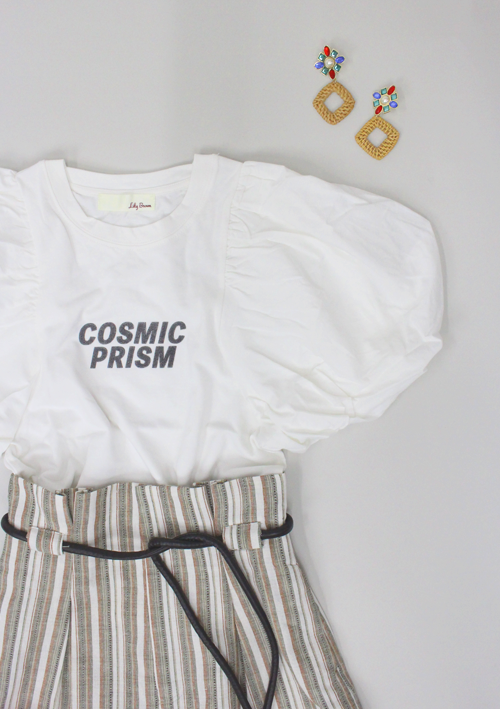今回合わせるロゴTは、バルーンスリーブの進化系Tシャツで、ガーリーに着こなして。