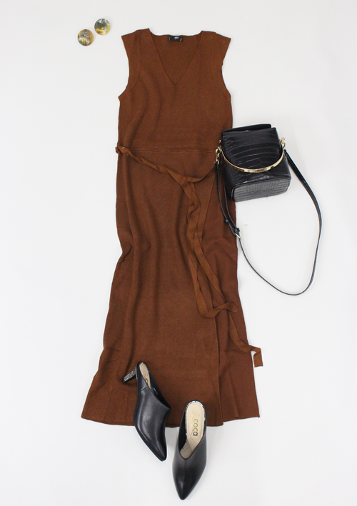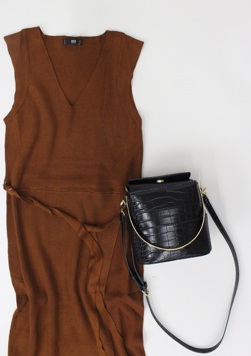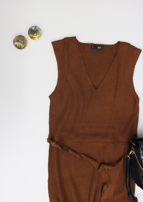 ブラウンのVネックニットワンピースを、大人レディに着こなして。