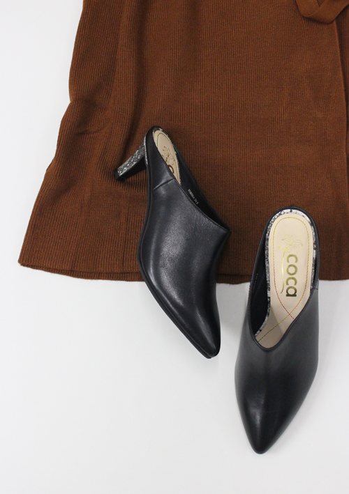 足元は、COCAのポインテッドトゥミュールを合わせて。