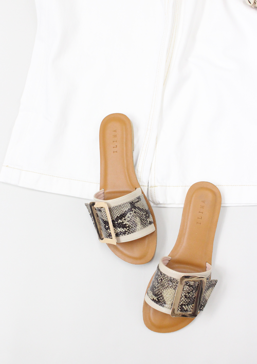 足元にはILIMAのパイソン柄ベルトフラットサンダルを合わせて。