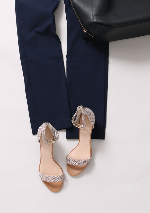 メタルループのアンクルストラップが特徴の上品サンダル。