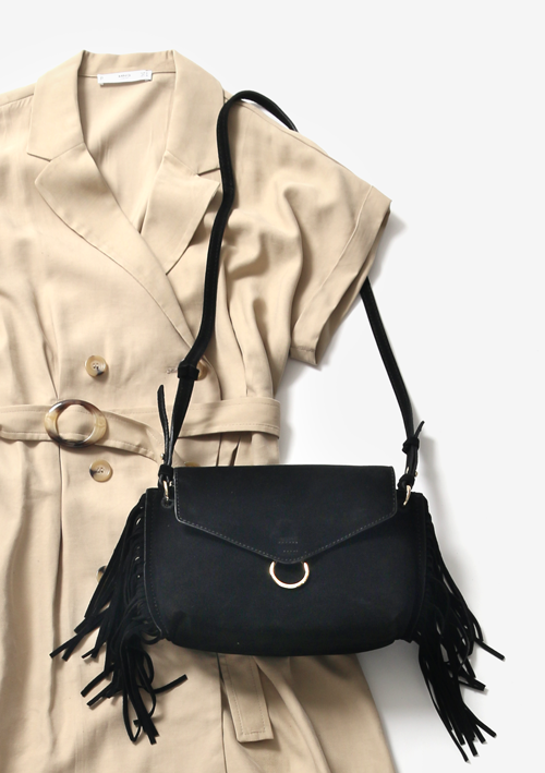 フリンジデザインのバッグは、サファリルックにピッタリのアイテム。ウエストポーチを合わせても◎