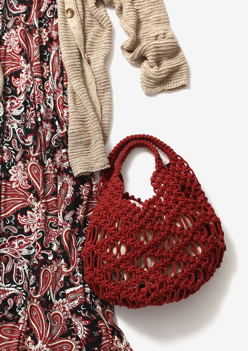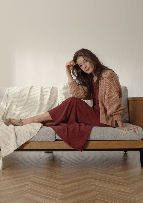 室内など少し肌寒い時のカーディガンは、薄めのざっくりカーディガンでリラックス感を演出して。
