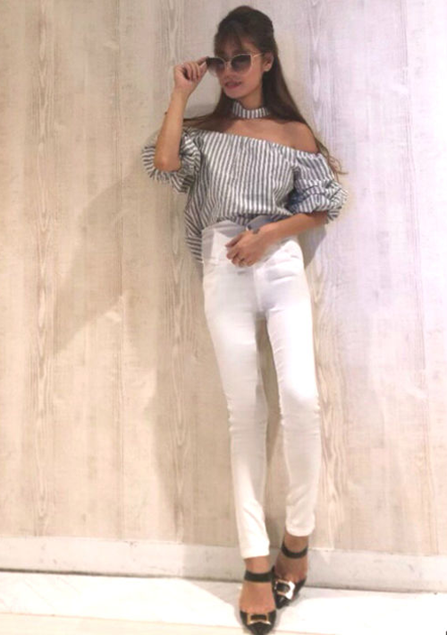 袖にボリュームがあるチョーカートップスはセクシーさを兼ね備えながらもガーリーに決まりすぎないアイテム。