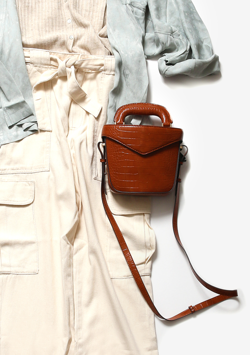差し色はテラコッタカラーで統一して、コーディネートにアクセントを加えて。