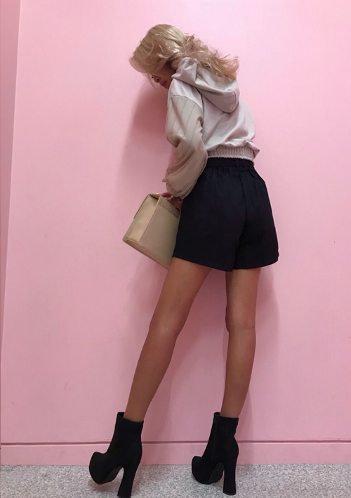 ショート丈とハイウエストの組み合わせでスタイルアップコーデです。