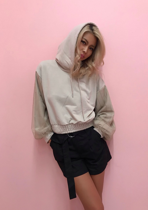 在感のある袖のチュール使いで、鮮度あふれるカジュアルコーデへ導くパーカー。