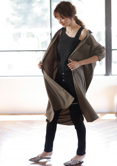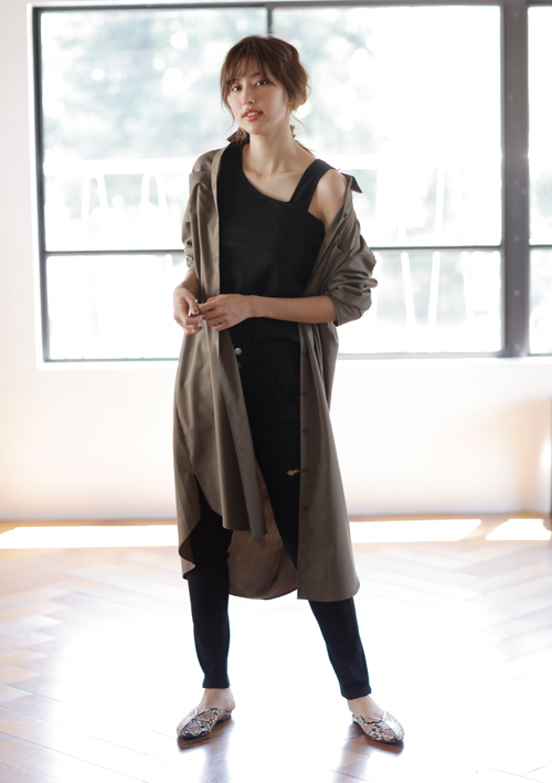 ハリと光沢感のある素材で仕立てたシャツ襟デザインが爽やかな大人のロングシャツにインナーを合わせてシンプルなハイウエストスキニーでまとめたコーデ。