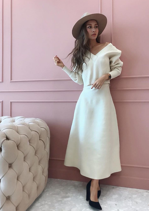 ふんわりとしたアンゴラの風合いが際立つニットに、ふんわり広がるシルエットが女性らしいスカートを合わせたコーディネート。
