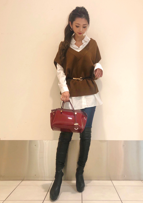 サラッとした裏地で着心地のよいシャツ付きニットベストにすっきりとみせてくれるスキニーパンツをあわせたコーディネート。