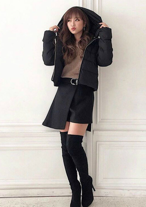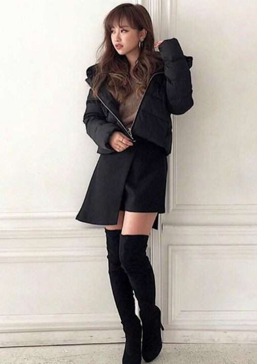 カジュアルなダウンにはスカパン×ニーハイで女らしさをプラスしたコーディネート。