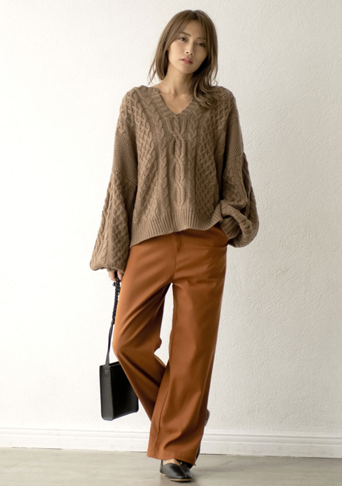 ボリュームのあるぽわん袖と、キーネックデザインの組み合わせが新鮮なトレンドのシルエット。