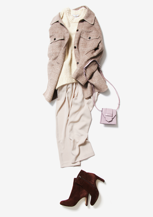 トレンドのシャツジャケットを取り入れた、大人カジュアルなコーディネート。