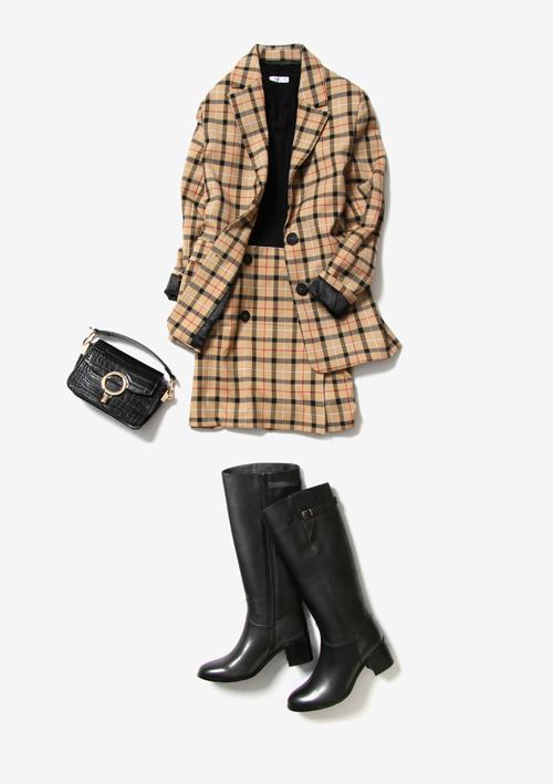 今季のトレンド「ロングブーツ」を使って、クラシックなスタイルに。