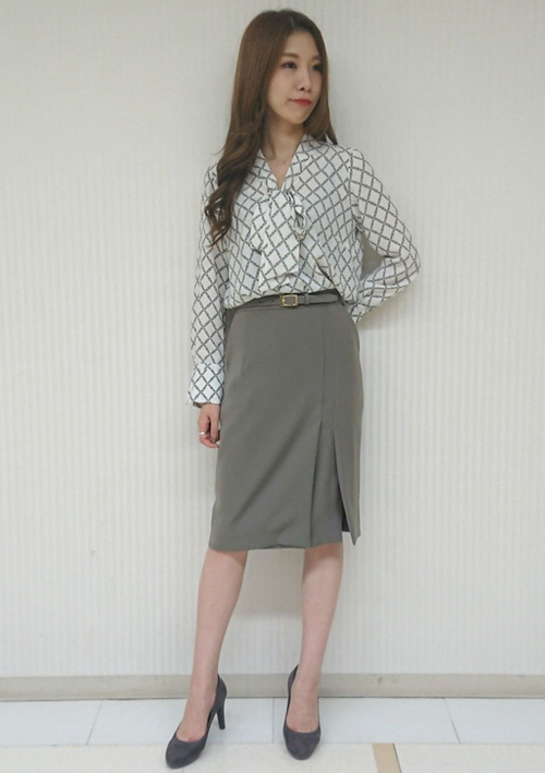 華やかさと知的さを兼ねたビットチェックのボウタイブラウスと、一見シンプルな技ありスカートの組み合わせです。