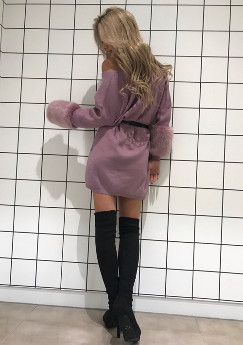 袖のファーが目をひくニットワンピのコーディネート。