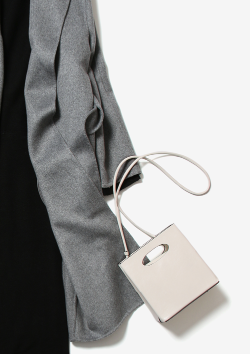 グレーのコートとグレーのブーツに、反対色のホワイトのバッグでバランス良く◎