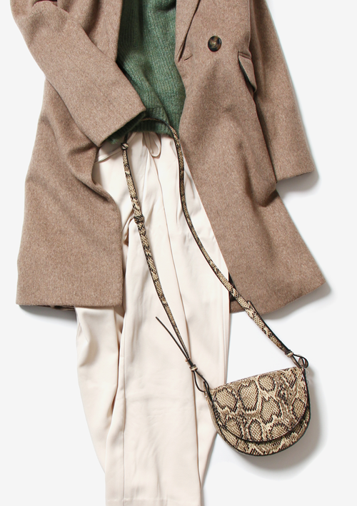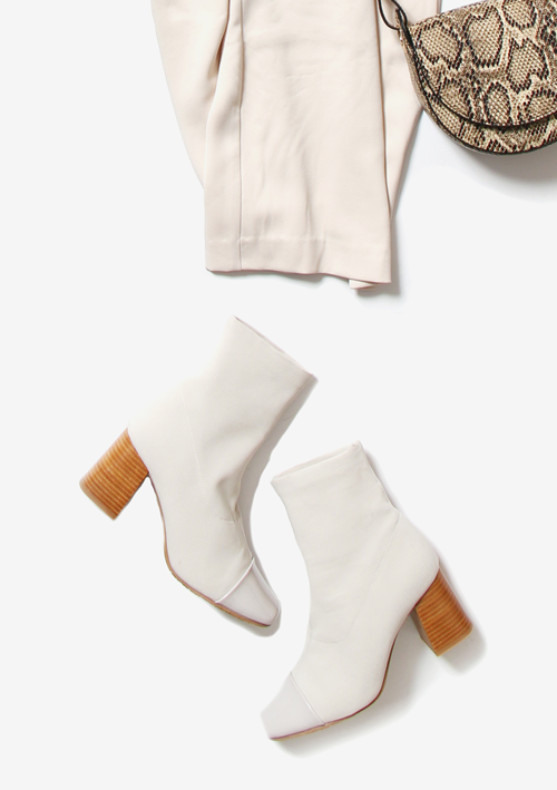 アイボリーのパンツとアイボリーのブーツの同色系で合わせると、脚長効果も◎