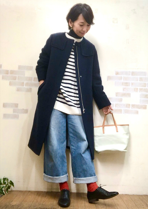 ゆとりのあるサイズ感と、右脇のファスナーで冬のレイヤードスタイルをいろいろと楽しめます。