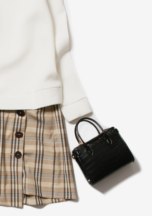 チェックのミニスカは、バーバリーチェックのような大きめチェック柄がかわいいので、コーディネートの主役に。