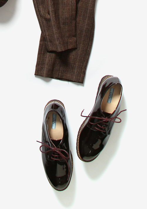 レースアップシューズはマニッシュな印象ですが、ワインカラーはどんなコーディネートにも馴染むので特にオススメ。