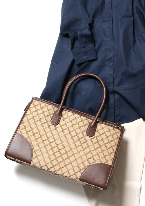 今季トレンドの大きめバッグは、コーディネートの主役になるような柄物をチョイスするのがオススメ。