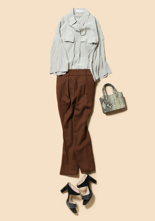 トレンドを抑えたグリーン×ブラウンで、こなれた雰囲気を演出できます。