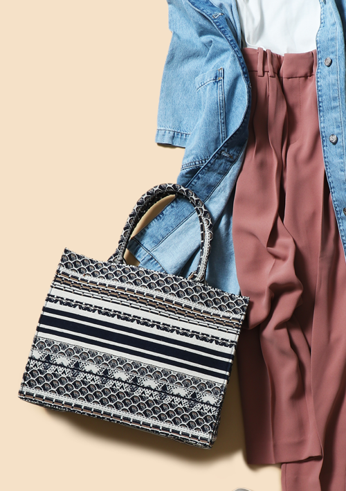 ロングのデニムジャケットは、この春トレンドのピンクパンツとの相性抜群。